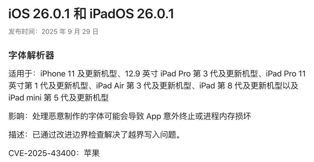 苹果还顺手修了一个叫“字体解析器”的安全漏洞。黑客能用特别的字体文件让 APP 崩溃,甚至破坏内存。