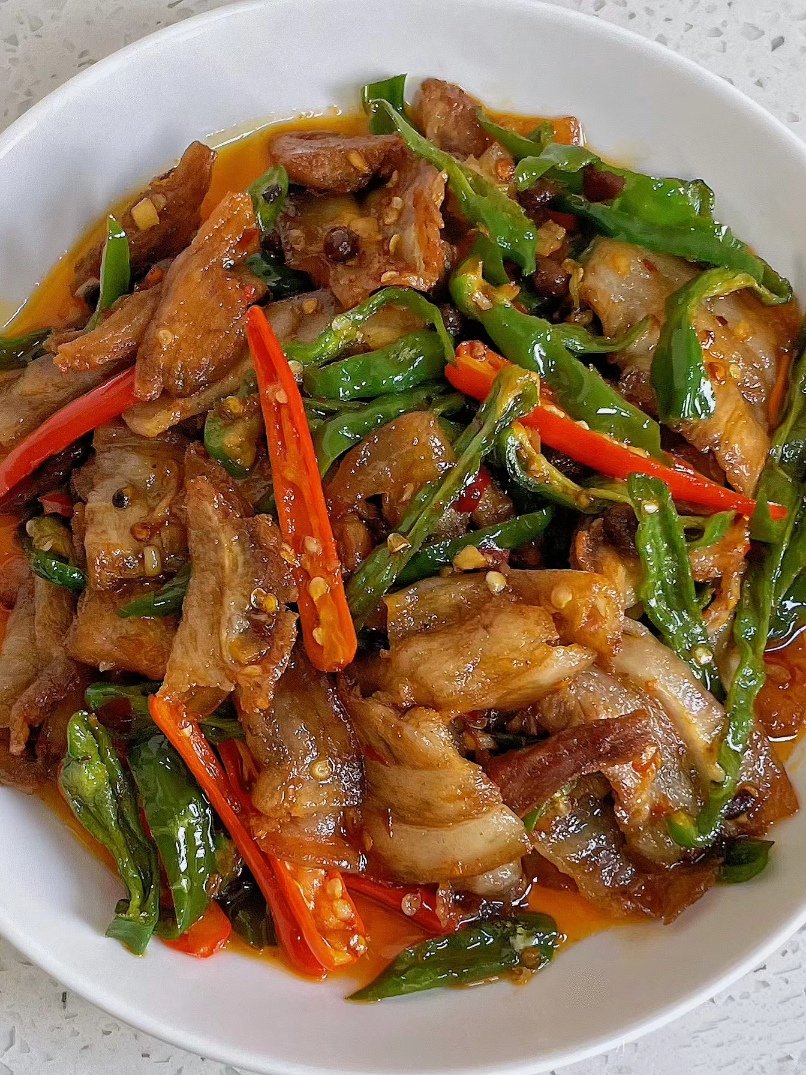 - 热锅凉油:锅里放一点油,不要太多,因为五花肉本身就会出油。油热后,把切好的五花肉片放进去,用中火慢慢煸炒。这时候要有耐心,把五花肉里的油脂煸出来,炒到肉片微微卷曲,表面有点焦黄,这就是传说中的“灯盏窝”状。