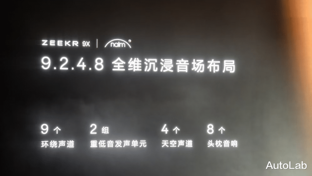 音响方面,极氪9X搭载了英国的Naim音响系统,采用了9.2.4.8音场布局(9个环绕声道,2个中置声道,4个天空声道,8个头枕音响),包括32个扬声器,总功率达到目前行业最高的3868W。