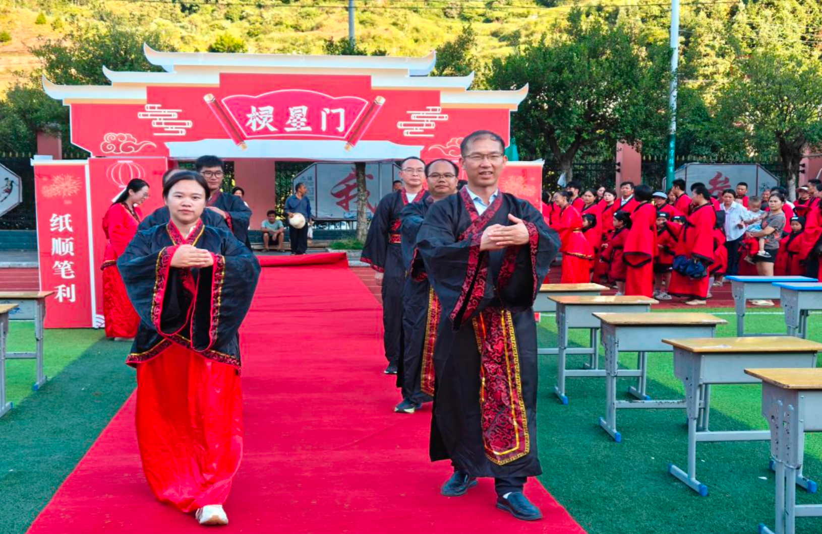 9月17日,从江县城关第四小学2025级新生开笔礼在学校足球场隆重举行。活动以“一撇一捺启新程,一笔一画绘童年”为主题,一年级全体师生及家长共同参与。活动借传统礼仪启迪童智、传承中华优秀传统文化,开场由学校舞蹈社团献上一支优雅的传统舞蹈,为开笔礼拉开帷幕。