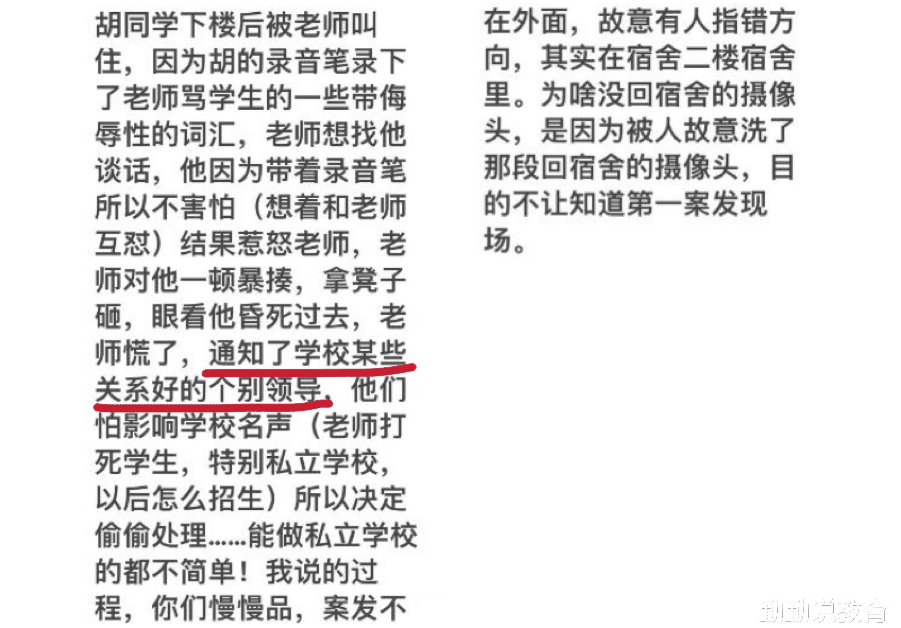 但是大家都忽略了一个重要的点,那就是“录音笔”这个录音笔是事发前几天,胡鑫宇的亲哥哥买来给胡鑫宇上课学习用的,胡鑫宇是10月9日收到的录音笔,正好是星期天。而事发当天是14号,也就是星期五,也就是说如果胡鑫宇的录音笔真的是需要学习用的,那么完全可以询问胡鑫宇身边的同学,更重要的是同桌,看胡鑫宇上课期间是否有用,因为对于这一点,身边同学是最为清楚的。