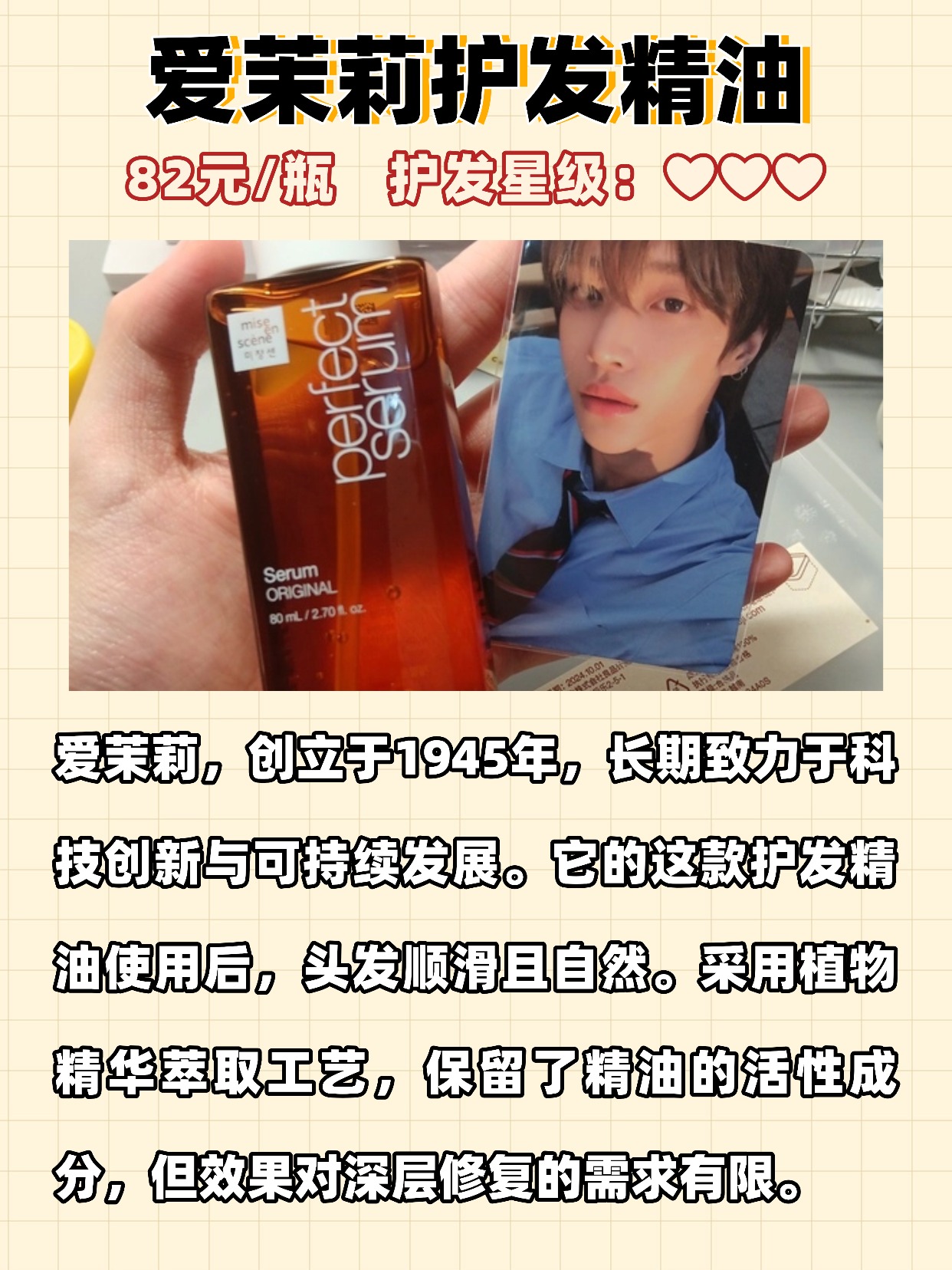 好多人问护发精油哪款不油腻,这问题我太有发言权了!顺便说说如何判断精油好坏,避开油腻坑。首先看质地,倒在手心里流动性强、像水一样的基本不油腻,那种浓稠得像蜂蜜的肯定粘腻;然后看成分,选霍霍巴籽油、白池花籽油这些轻质植物油的,比矿物油、硅油类的清爽多了;还可以试吸收速度,搓热后涂在发尾,3 秒内吸收不粘手的才合格。我测评过一款号称清爽的精油,结果涂完头发油得像打了发蜡,一看成分表前几位全是廉价硅油,踩雷踩得心疼。千万别光看宣传,自己学会判断才靠谱。接下来分享自己选购护发精油时的一些经验,都是踩坑总结的干货,感兴趣的可以蹲蹲。
