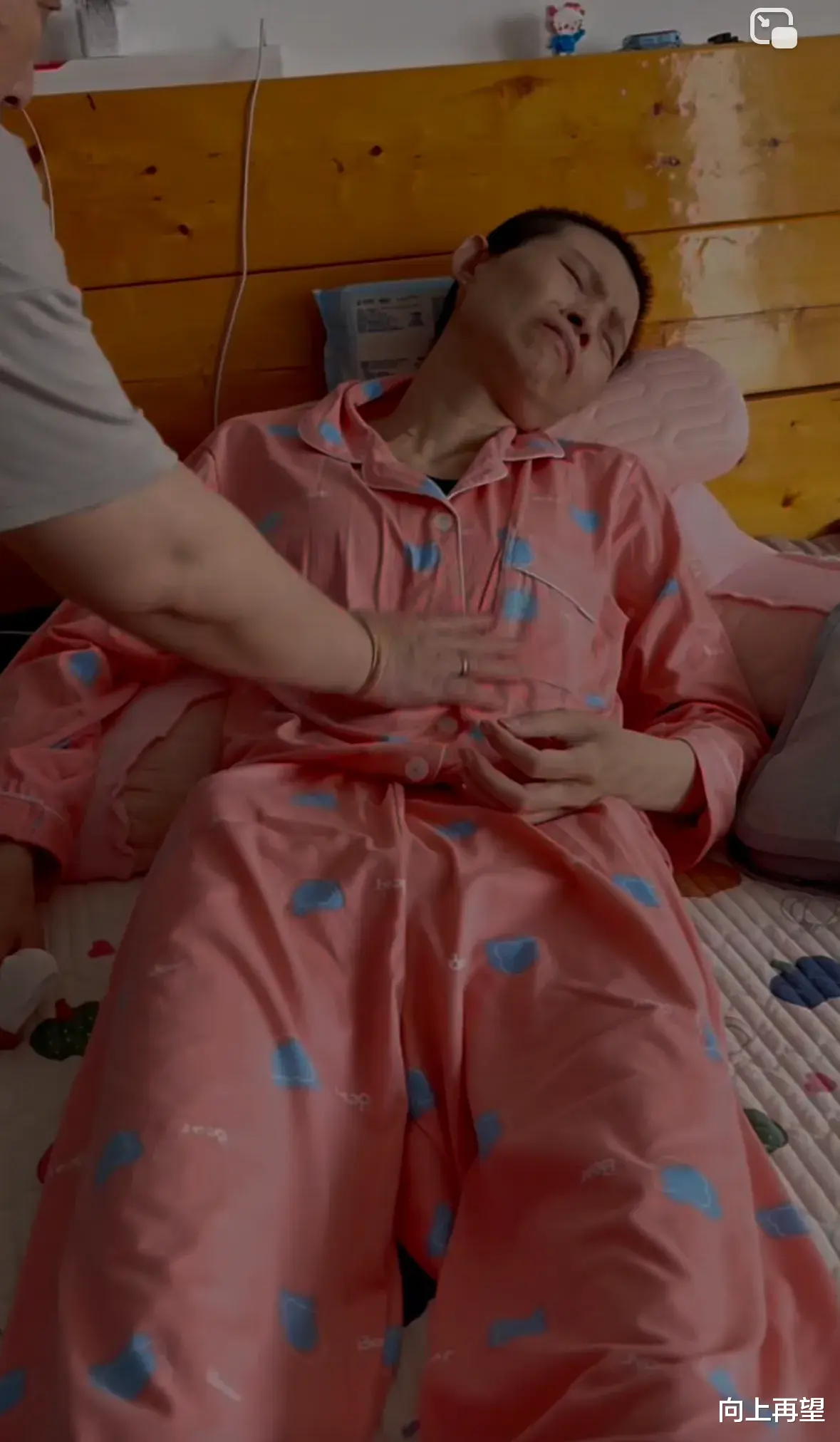 由于持续输液,妻子身体出现副作用,全身疼痛难耐,吃进去的东西没多久就会全吐出来,人变得嗜睡,头发也一把一把地掉。