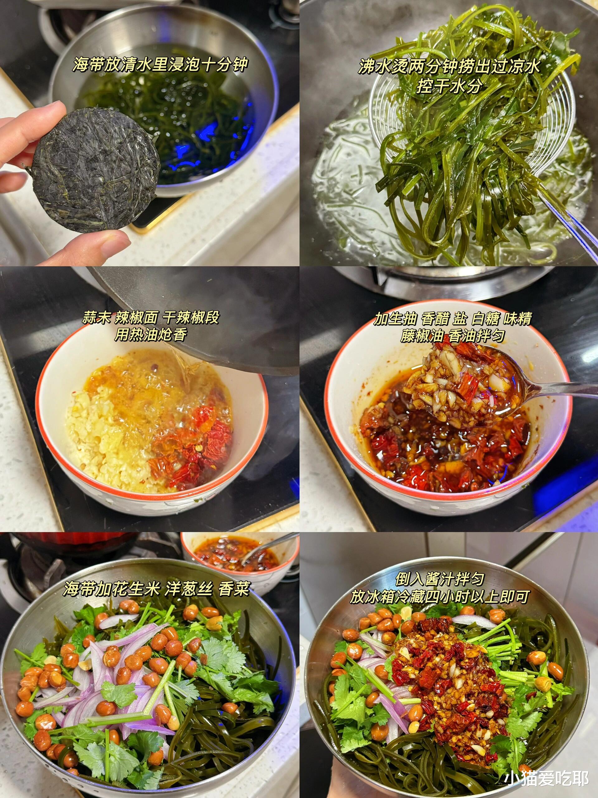 1. 泡发海带把压缩海带放入大碗中,加入足够的温水,浸泡30分钟左右。泡发后的海带会膨胀很多,所以记得用大碗哦。泡好后,把海带清洗干净,去除表面的杂质和黏液。小技巧:泡发海带的时候,可以在水里加一点白醋,这样泡发出来的海带不仅更脆,还能去除海带的腥味。