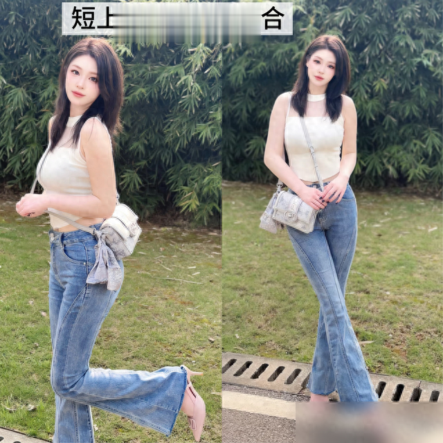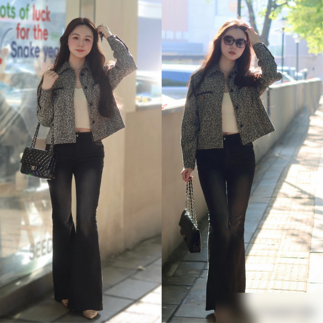 搭配上也有巧思:短上衣+喇叭裤+高跟鞋,上短下长的比例+鞋跟的高度,直接把“腿长一米八”写在脸上;西装外套+喇叭裤,利落的西装线条和喇叭裤的柔美一中和,职场穿它既专业又有女人味;最妙的是小香风上衣+喇叭裤,珍珠扣、粗花呢的精致感和喇叭裤的复古感一结合,像从老电影里走出来的美人。