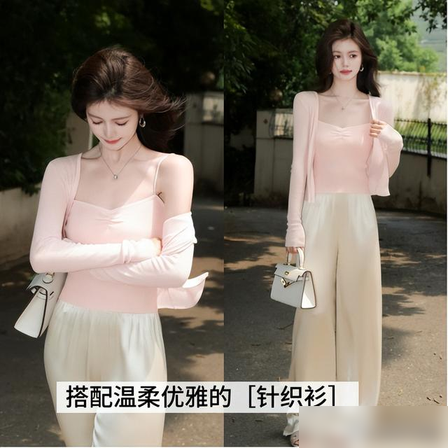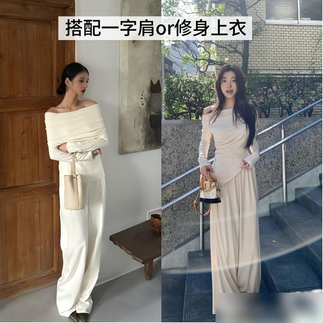 搭配上更有讲究:新中式上衣配醋酸裤,盘扣、立领的细节和缎面的光泽一碰撞,直接把“东方美”焊在身上,40+的姐姐穿它,气质比戴珠宝还显高级;一字肩上衣配醋酸裤,露一点锁骨和肩线,性感得恰到好处,30+的轻熟女生穿它,既不会太嗲又不会太老气;最绝的是薄针织配醋酸裤,薄荷绿、奶油白的针织衫软fufu的,搭米白色醋酸裤,走在春天的风里,连路人都会忍不住回头看。