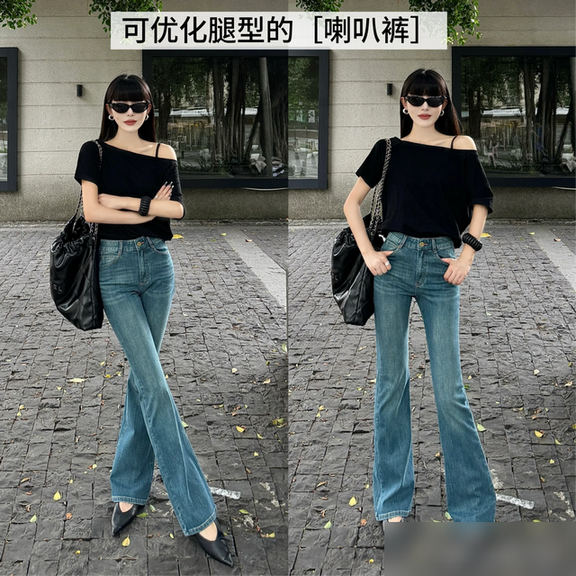 高腰喇叭裤的裤头卡在腰线,裤管从膝盖往下慢慢散开,能把O型腿、X型腿的缺陷全盖住,还能拉长腿部线条——小个子女生穿它,配双高跟鞋,瞬间从155变165;腿直的女生穿它,裤管的弧度刚好修饰腿型,走路时裤脚扫过鞋面,连背影都自带“大长腿”特效。