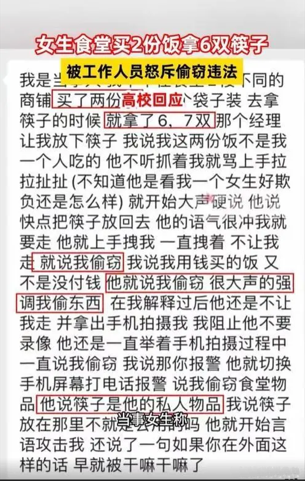 工作人员的态度特别强硬,骂骂咧咧声音大得好像要喊破天一样。女生一听就懵了:什么情况?我打了饭,拿几双筷子咋就违法了呢?她赶紧解释,说自己给钱打了饭,并不是无故进来顺几双筷子的。然而,这食堂工作人员根本听不进去,执意认为她是在偷窃,还拿起手机对着女生拍摄,一边拍还一边不停地说她是“小偷”!