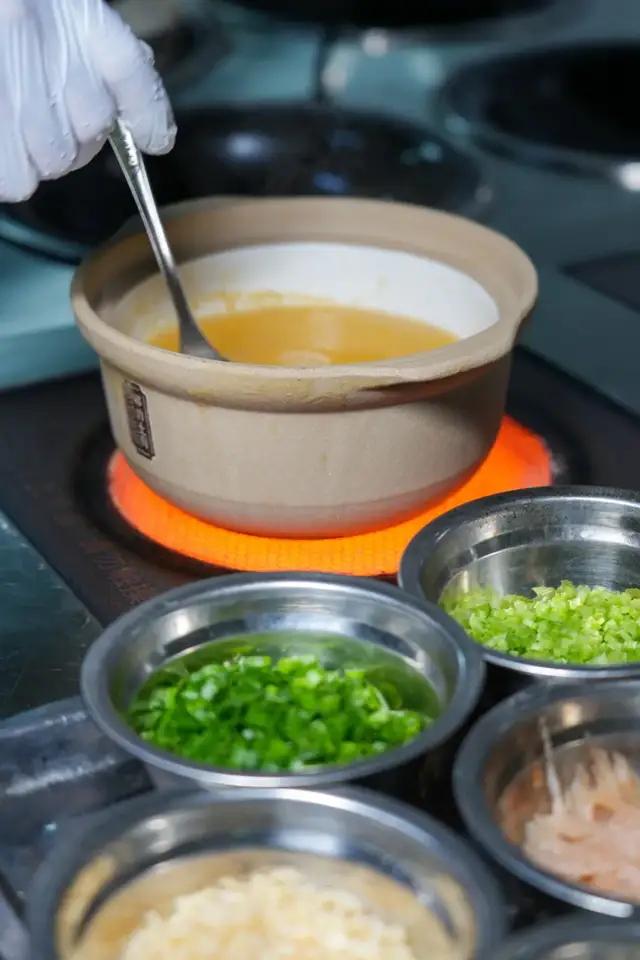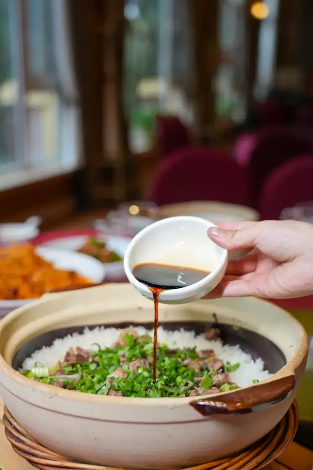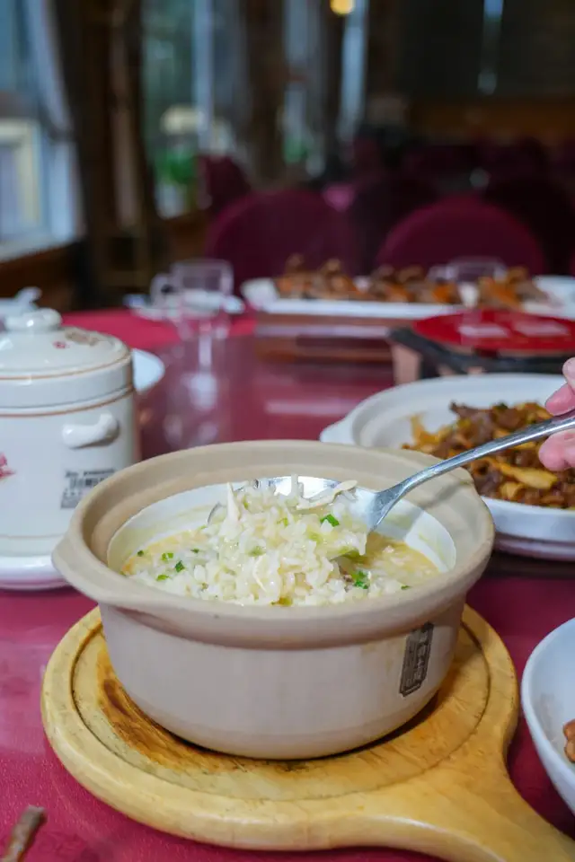 最后上桌加入豉油、搅拌,锅巴肉眼可见,鸽汤渗透每粒米,有滋味。