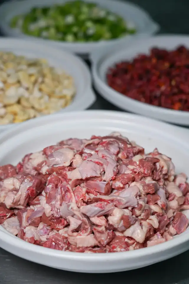 香辣红子鸽拌面,胡麻油煸炒鲜乳鸽,加四川的川椒,本地的线椒,加蒜苗,就着一份面。