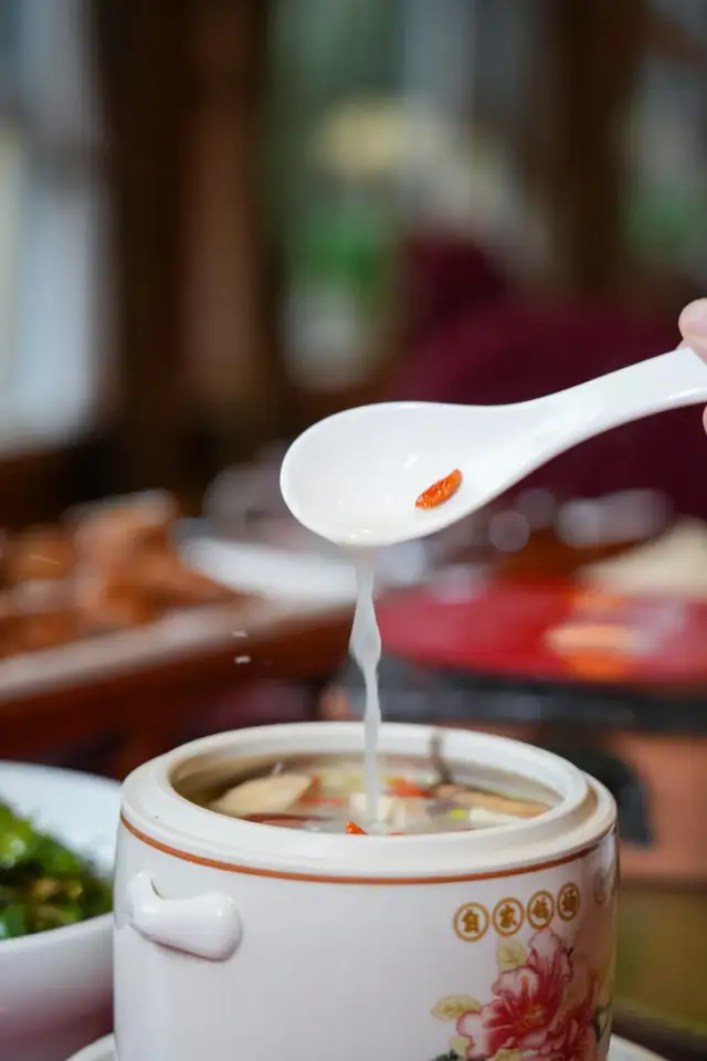 店里的鸽汤:黄芪,党参,当归,枸杞,银耳等,多种食材一起炖制,因为都是鲜乳鸽炖制,很多老顾客喜欢炖的浓一些。