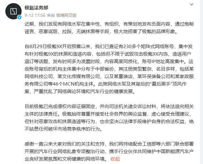 监管和法律双管齐下,极氪法务部积极响应号召,不仅悬赏500万征集黑公关线索,还对抹黑极氪9X的账号固定证据、递交诉讼材料。比亚迪、岚图汽车、鸿蒙智行、理想等众多车企也相继回应,共同抵制网络水军,希望能从根源上斩断黑手,如果一味妥协只会换来得寸进尺,重拳出击才是硬道理!