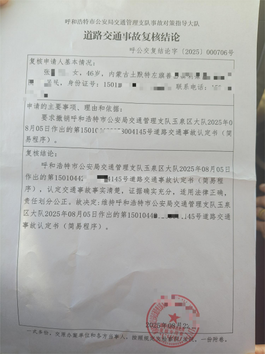 事后张某某按交警提示申请复核,要求撤销原认定书,但2025年8月22日出具的复核结论,最终维持了玉泉区大队的原认定结果。张某某坦言,事故涉及金额不大,自己执着此事“只是想要口气,争个公道”,可复核失败让她的权益维护之路更添阻碍。