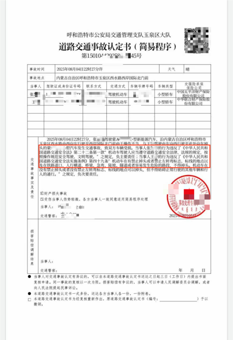 据呼和浩特市公安局交通管理支队玉泉区大队出具道路交通事故认定书显示,事故发生于2025年8月4日22时27分许。张某某驾驶小型新能源汽车,沿西水路由西向东行驶至西岸国际北门前,因操作不当,与由东向西行驶至此并向东掉头的王某所驾小型汽车相撞,导致双方车辆受损,无严重人员受伤,各方一致同意适用简易程序处理。