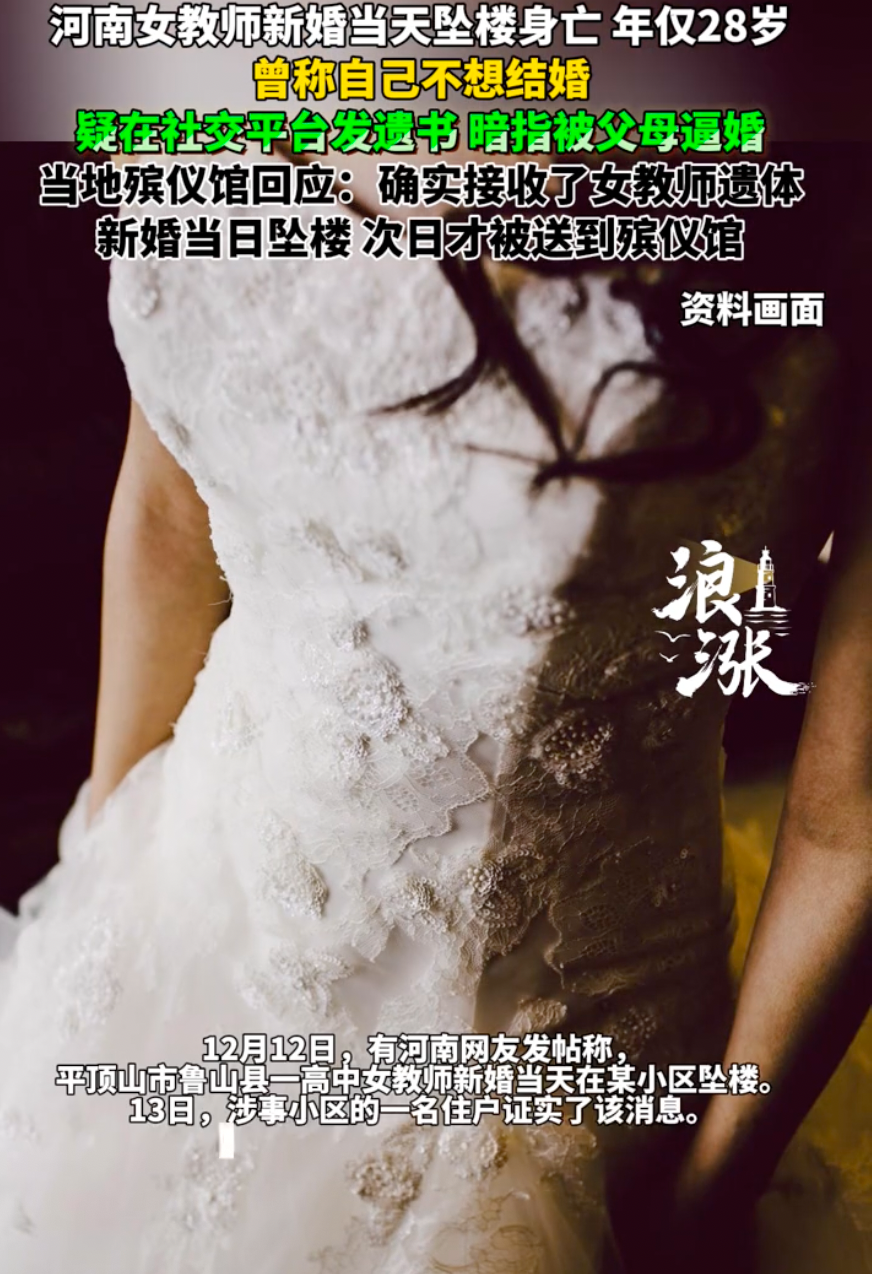 媒体报道,近日,鲁山县某高中28岁女教师,在婚礼当天从7楼跳下。28岁,新婚当天,从7楼纵身跃下——这几个词像块浸了冰的
