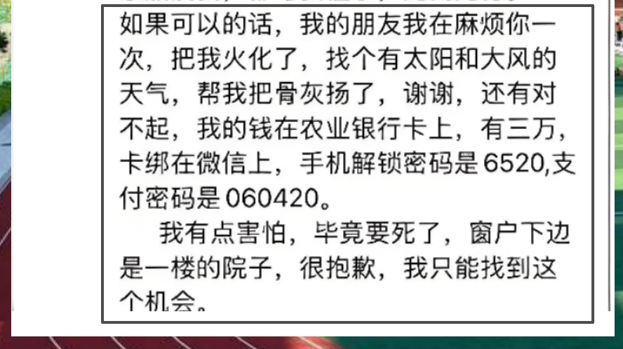 可就算到了最后一刻,她还在为别人着想:仔细写了银行卡密码和微信绑定,给朋友留了3万元答谢;说“很抱歉选了小区的院子”,因为“只能找到这个机会”;还请求朋友找个有太阳和大风的天气把骨灰扬了——她连死都怕麻烦别人,怕给别人添麻烦。