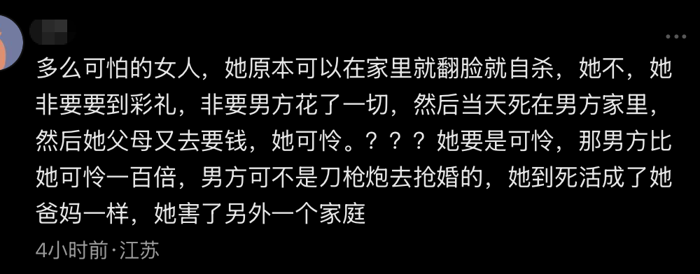 评论区里有人说她“害了另一个家庭”,说她“可以在家翻脸自杀”。这些话恰恰戳中了她的痛处——她的痛苦没人看见,她的选择没人尊重,所有人都活在“别人该怎么活”的期待里,连她的死都要被评判“是否得体”。有条高赞评论更让人揪心:“娘家说她嫁出去了不能收尸,婆家说她还没过门不能收尸。”连死后她都没个“落脚的地方”,像个被遗忘的孩子,这种悲哀比她的死更让人难受。