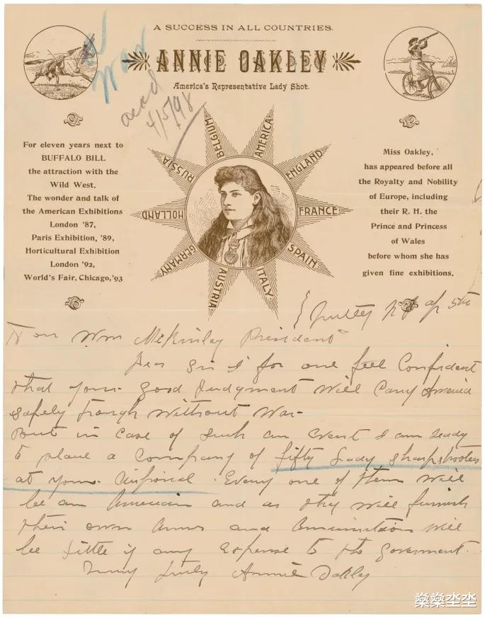 1898年,美西战争爆发,宣战前三周,安妮·奥克利致信威廉·麦金莱总统,表达了她竭尽所能报效祖国的坚定信念。