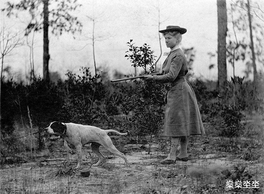 安妮和她的猎犬弗雷德一起狩猎,约1908年