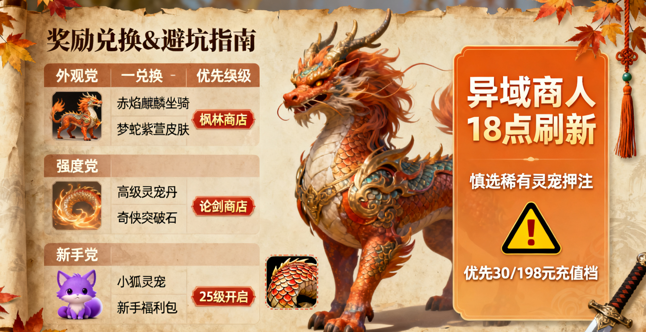强度党:「论剑商店」换「高级灵宠丹」「奇侠突破石」,优先提升主力阵容战力。