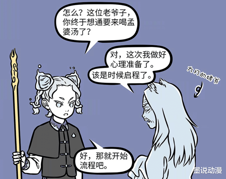 九月姥爷放弃投胎,所以也就不喝孟婆汤,随后更是丢下孟婆汤跑了。此时孟婆再度发飙,每次到这个节点,九月姥爷就是如此。牛头也见过太多这种例子,只能劝说孟婆冷静、淡定一些。不过按照剧情发展,九月姥爷估计会在下一话或者下下话投胎转世。