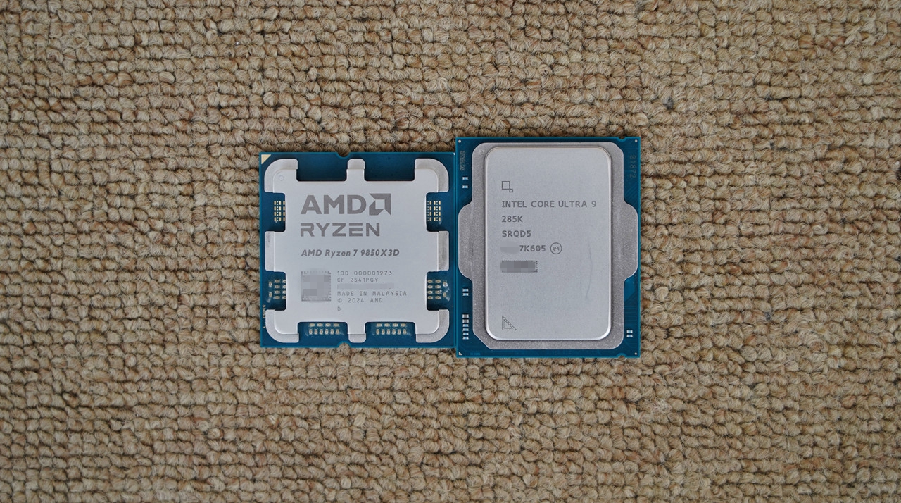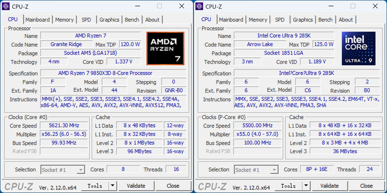 规格对比,锐龙7 9850X3D采用8核心16线程设计,主频为4.7GHz,最大加速频率为5.6GHz,L3缓存为96MB;Ultra9 285K采用24核心24线程设计,P核心主频为3.7GHz,最大睿频频率为5.5GHz,E核心主频为3.2GHz,最大睿频频率为4.6GHz,L3缓存为36MB。可以看出,无论是核心数量还是频率,Ultra9 285K都占据绝对优势。