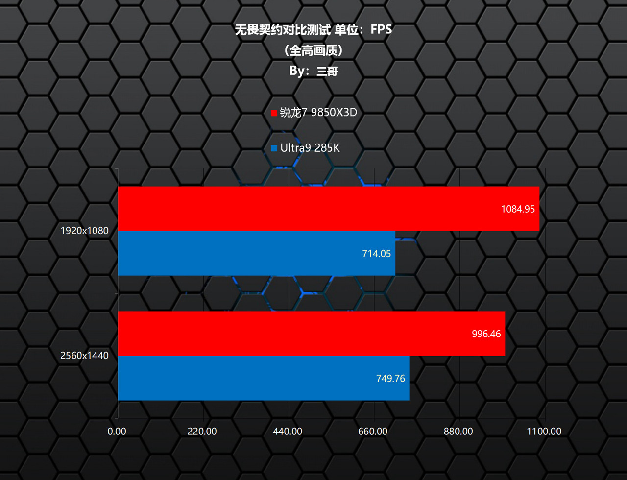 在《无畏契约》测试中,锐龙7 9850X3D相较Ultra9 285K,在两个分辨率下均有非常夸张的领先,其中1080P分辨率下领先了370.90帧,领先比率51.94%;1440P分辨率下领先了246.70帧,领先比率32.90%。另外,锐龙7 9850X3D在该游戏中轻松实现了平均帧破千帧的表现。