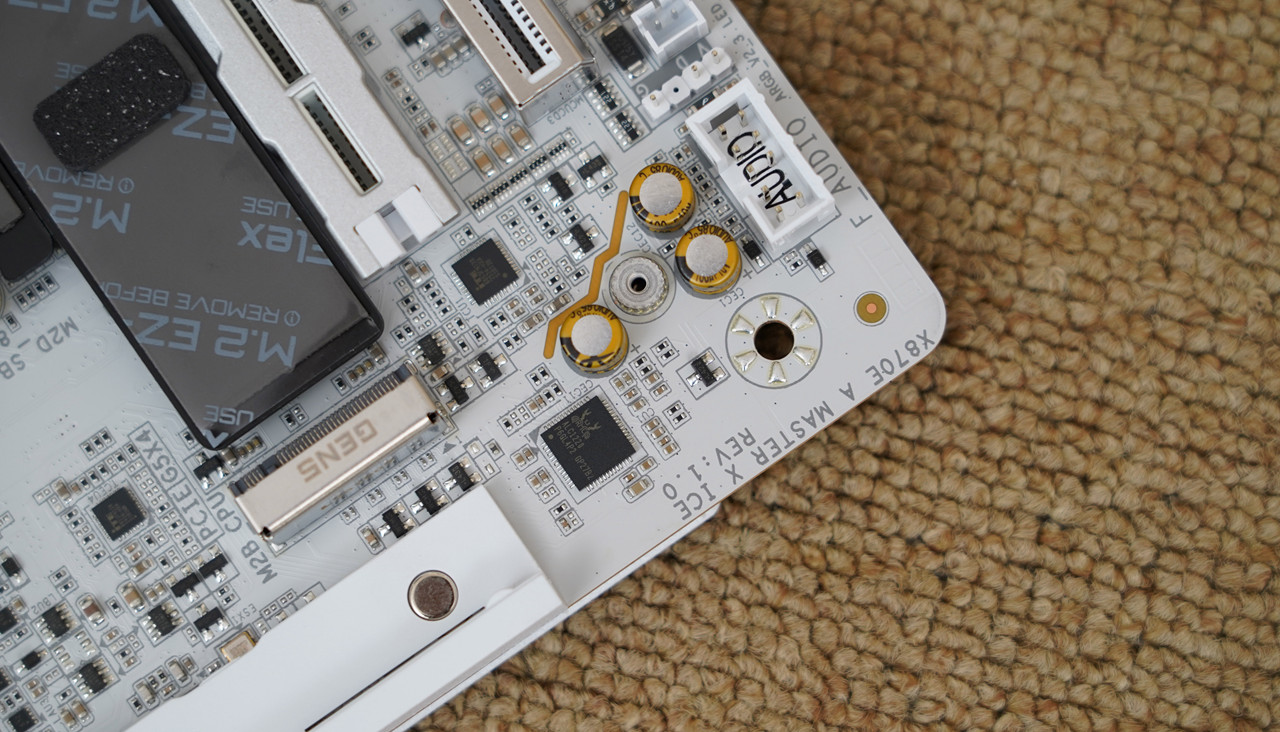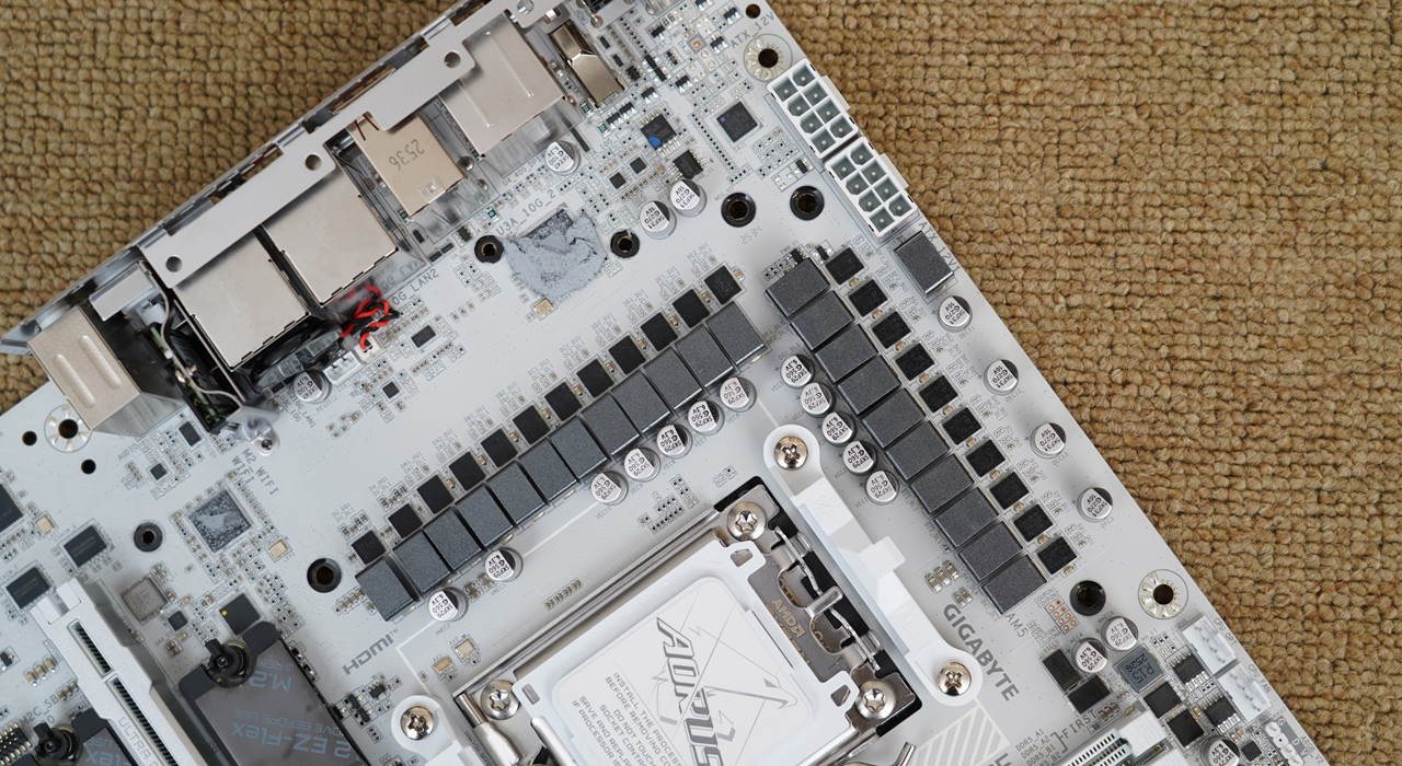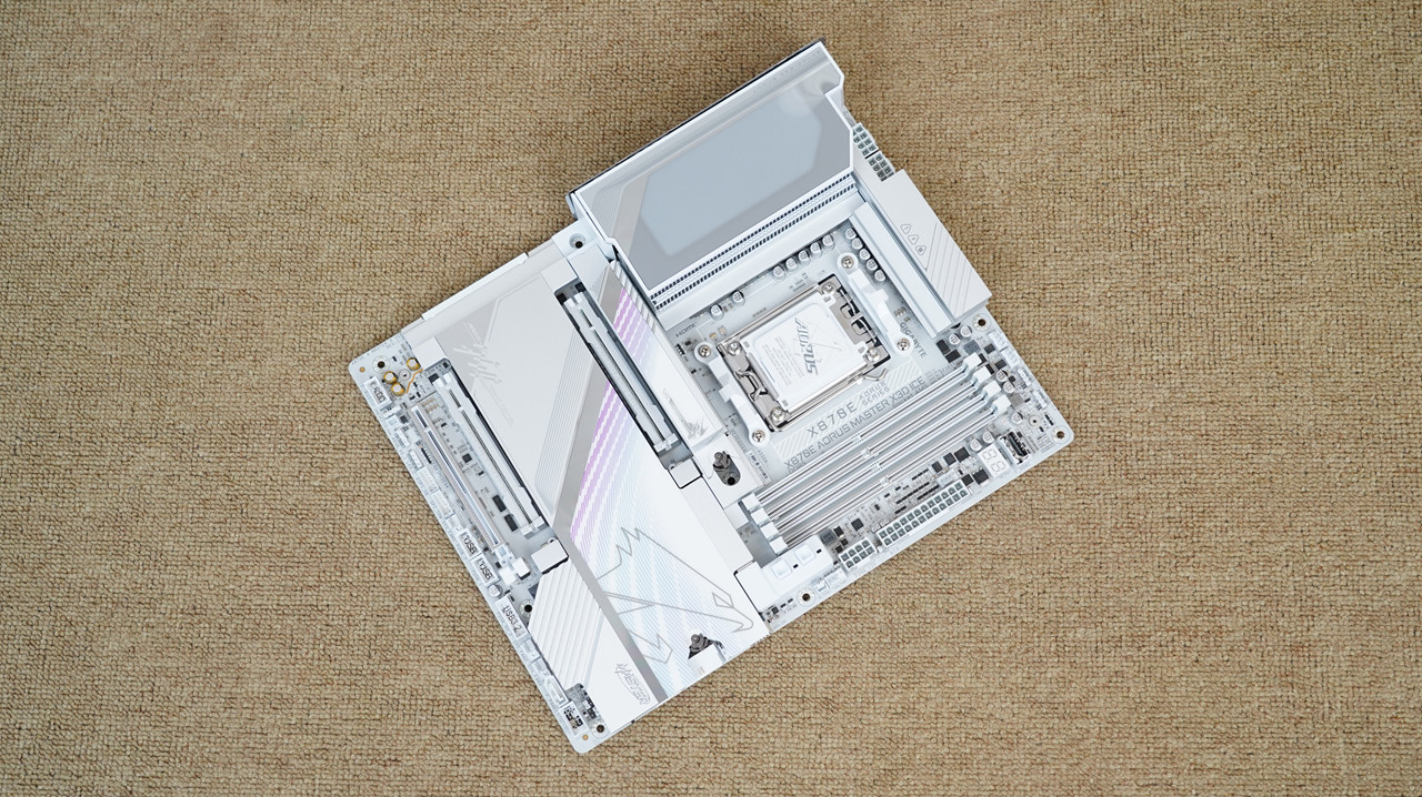 主板使用了技嘉 X870E AORUS MASTER X3D ICE,该主板采用纯白色设计,外观颜值非常高,做工也非常奢华,8层2盎司铜低阻抗PCB配合18+2+2相供电设计,应付旗舰级的处理器也毫无压力;主板的功能也非常强大,X3D鸡血模式+D5黑科技2.0能够大大释放CPU的潜能,同时主板的各类扩展接口也非常丰富,非常适合高端玩家选用。