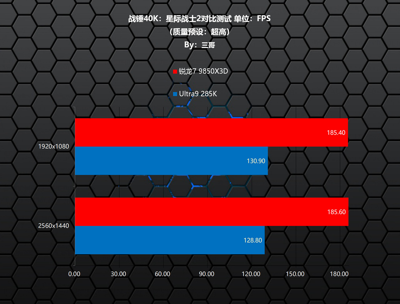 在《战锤40K:星际战士2》测试中,锐龙7 9850X3D相较Ultra9 285K,在两个分辨率下均有非常夸张的领先,其中1080P分辨率下领先了54.50帧,领先比率41.63%;1440P分辨率下领先了56.80帧,领先比率44.10%。