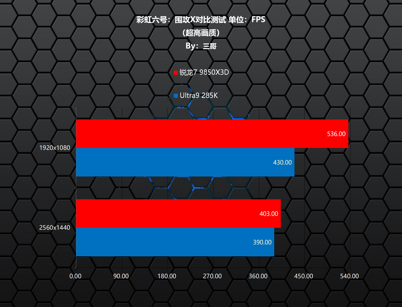在《彩虹六号:围攻X》测试中,锐龙7 9850X3D相较Ultra9 285K,在两个分辨率下有不同程度的领先,其中1080P分辨率下领先了106.00帧,领先比率24.65%;1440P分辨率下领先了13.00帧,领先比率3.33%。