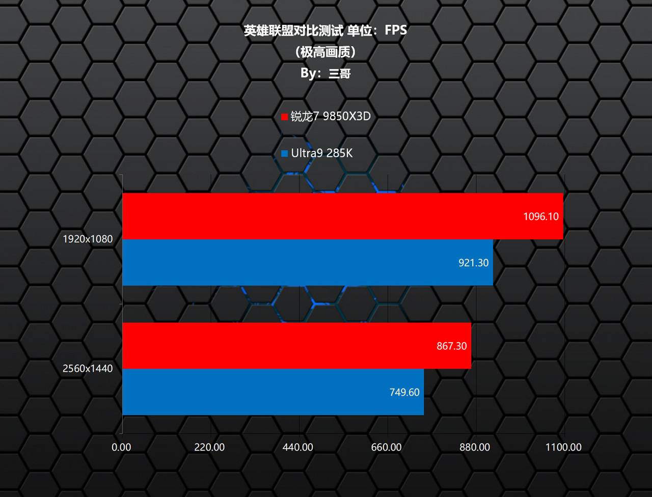在《英雄联盟》测试中,锐龙7 9850X3D相较Ultra9 285K,在两个分辨率下均有大幅度的领先,其中1080P分辨率下领先了174.80帧,领先比率18.97%;1440P分辨率下领先了117.70帧,领先比率15.70%。另外,锐龙7 9850X3D在该游戏中也轻松突破了千帧。