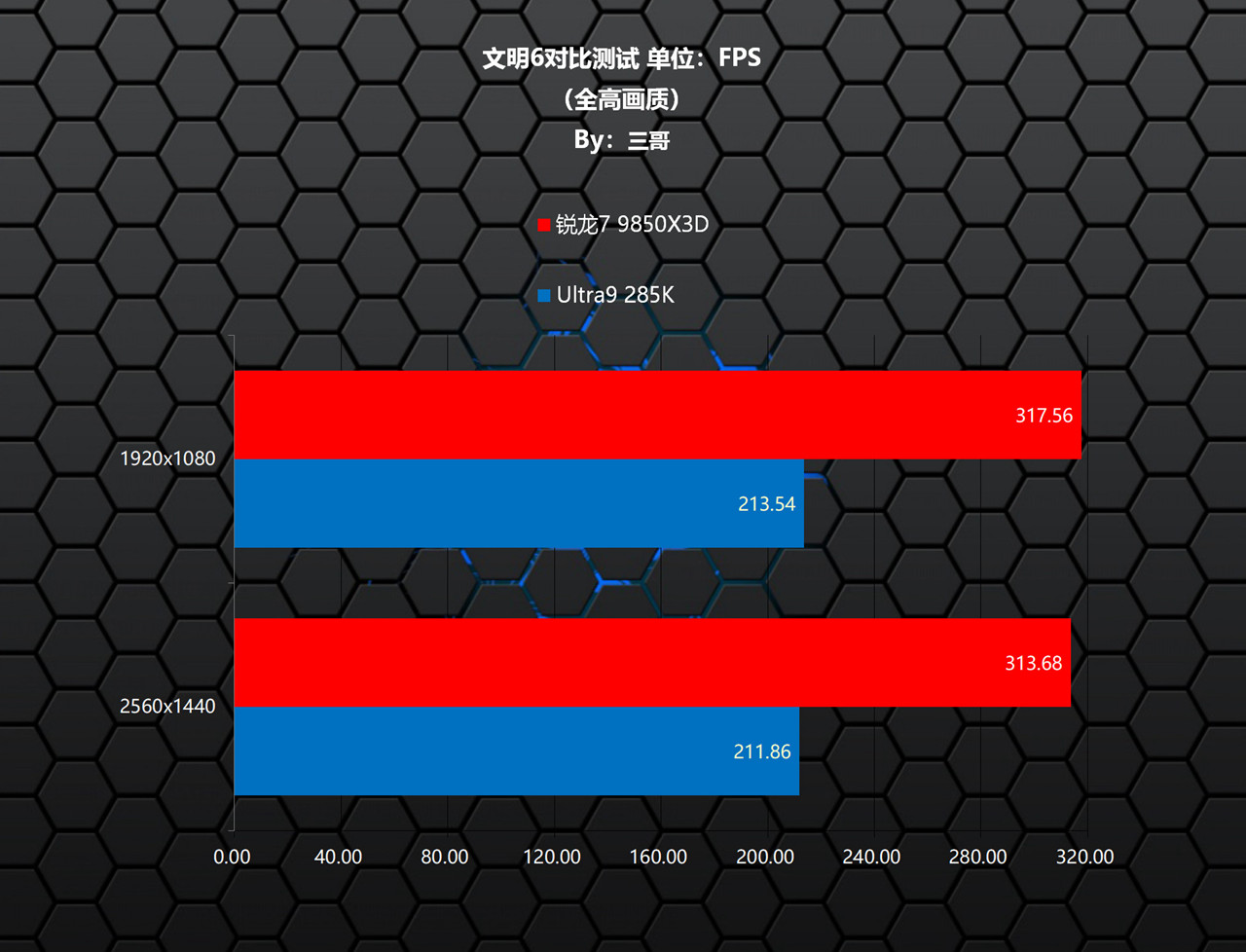 在《文明6》测试中,锐龙7 9850X3D相较Ultra9 285K,在两个分辨率下均有非常夸张的领先,其中1080P分辨率下领先了104.02帧,领先比率48.71%;1440P分辨率下领先了101.82帧,领先比率48.06%。