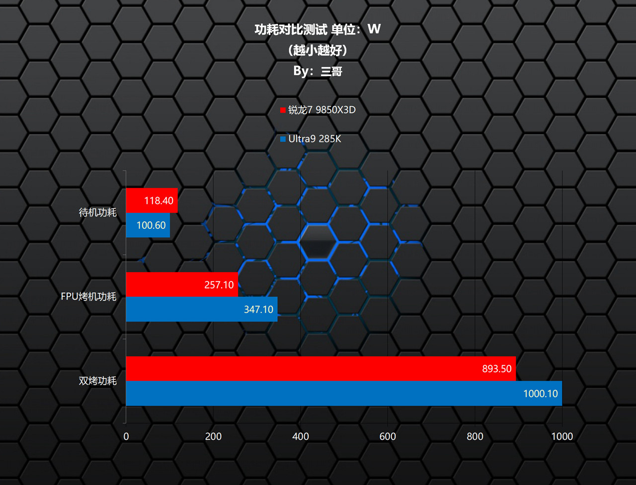 功耗对比测试,可以看出,除了待机功耗略高点,锐龙7 9850X3D的FPU烤机功耗和双烤功耗都要远低于Ultra9 285K。