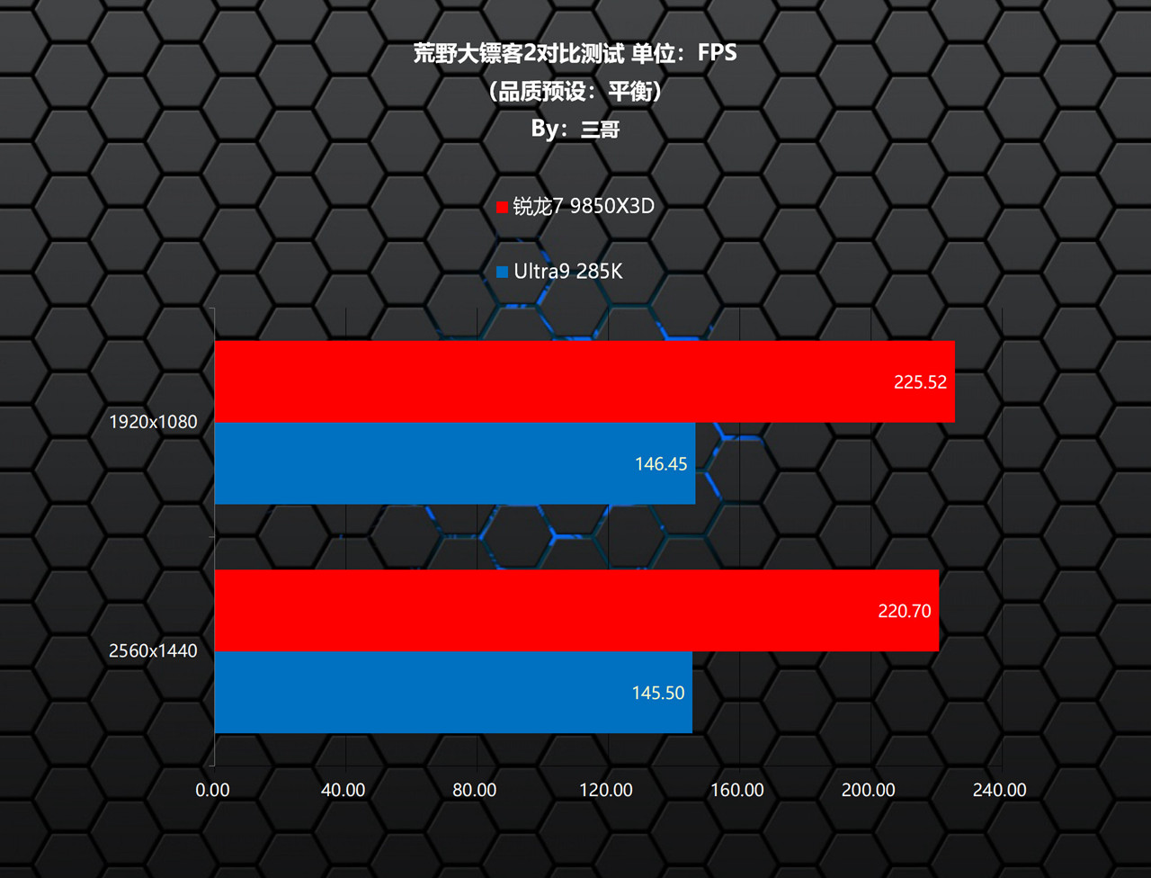 在《荒野大镖客2》测试中,锐龙7 9850X3D相较Ultra9 285K,在两个分辨率下均有非常夸张的领先,其中1080P分辨率下领先了79.07帧,领先比率53.99%;1440P分辨率下领先了75.20帧,领先比率51.68%。