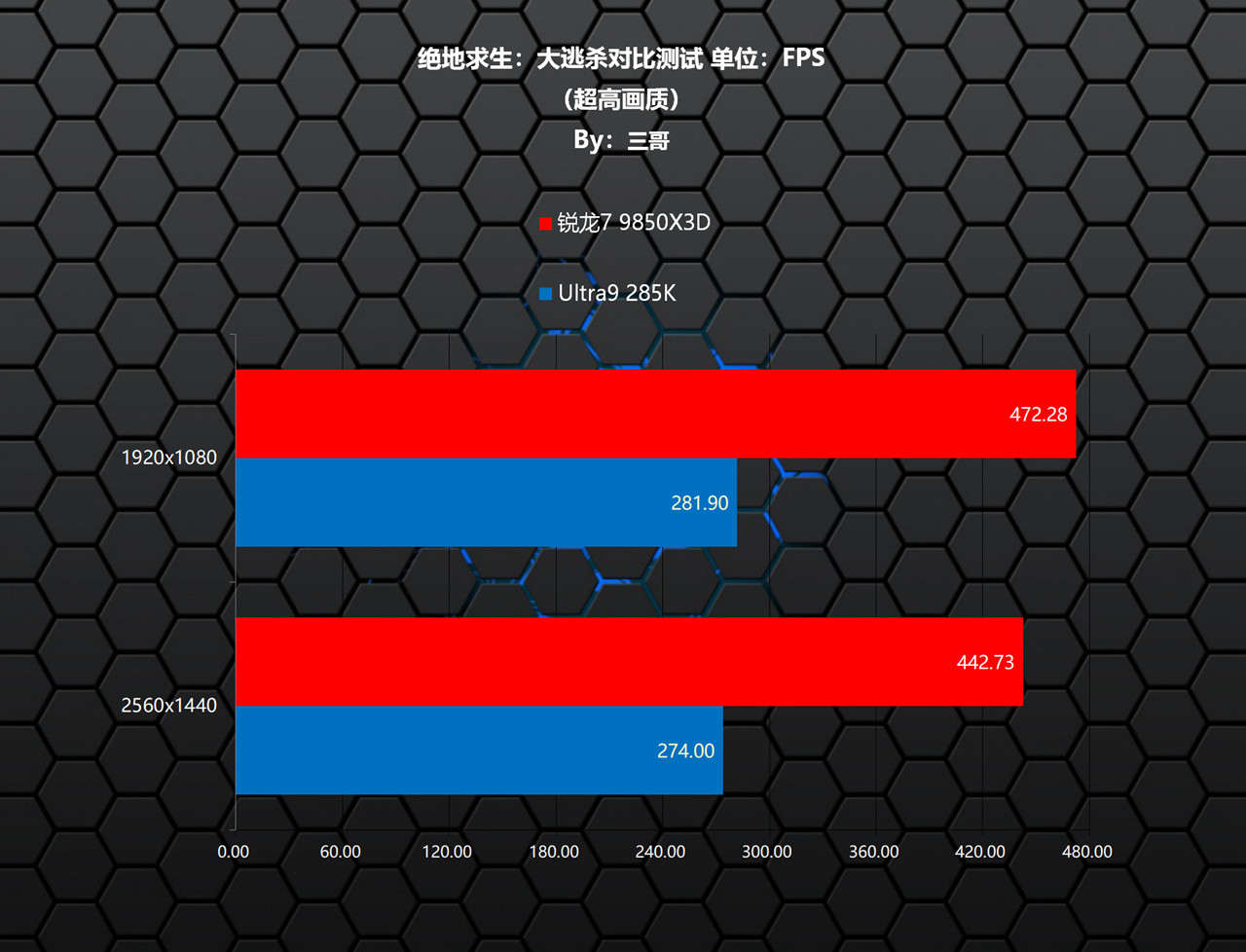 在《绝地求生:大逃杀》测试中,锐龙7 9850X3D相较Ultra9 285K,在两个分辨率下均有非常夸张的领先,其中1080P分辨率下领先了190.38帧,领先比率67.53%;1440P分辨率下领先了168.73帧,领先比率61.58%。