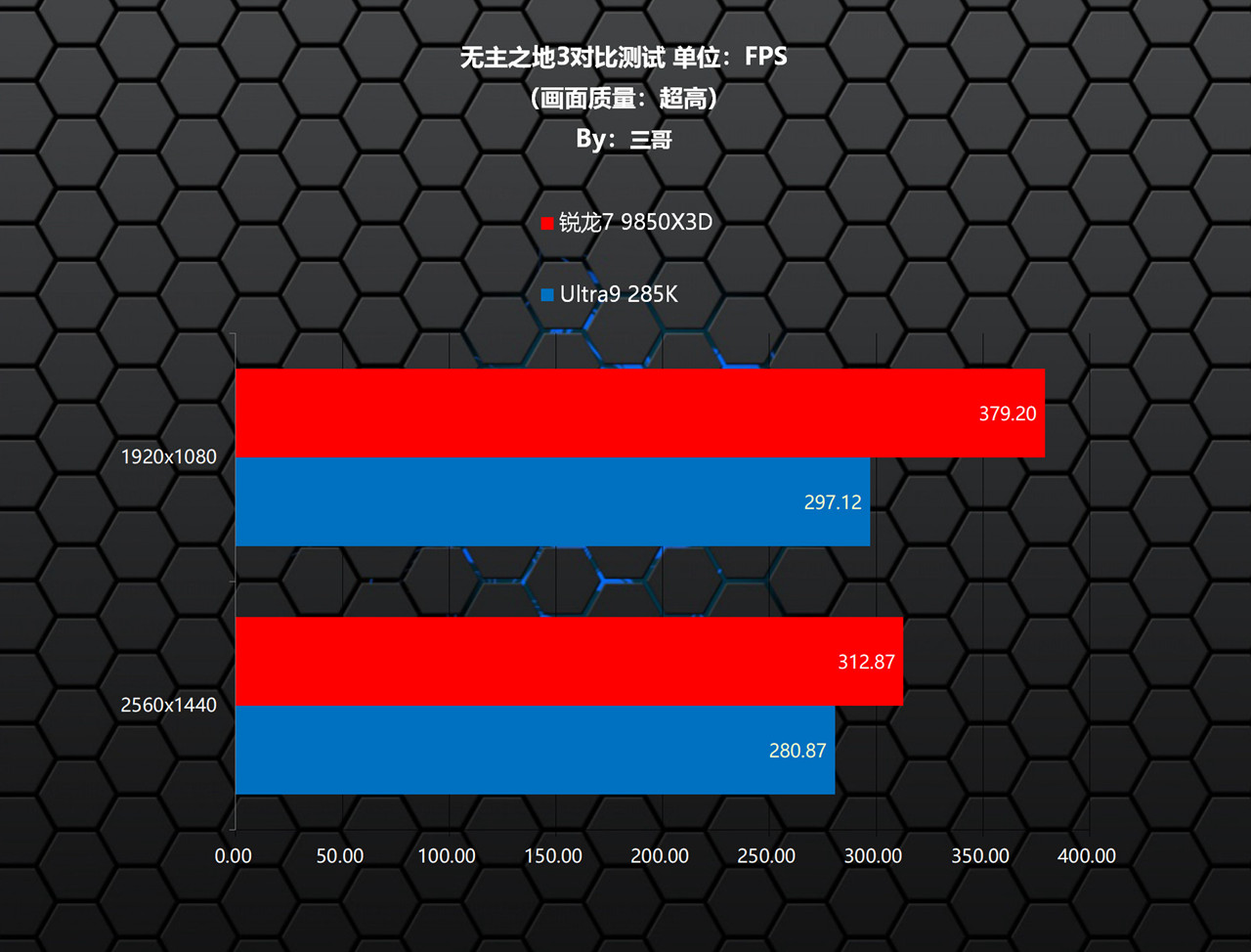 在《无主之地3》测试中,锐龙7 9850X3D相较Ultra9 285K,在两个分辨率下均有大幅度的领先,其中1080P分辨率下领先了82.08帧,领先比率27.63%;1440P分辨率下领先了32.00帧,领先比率11.39%。