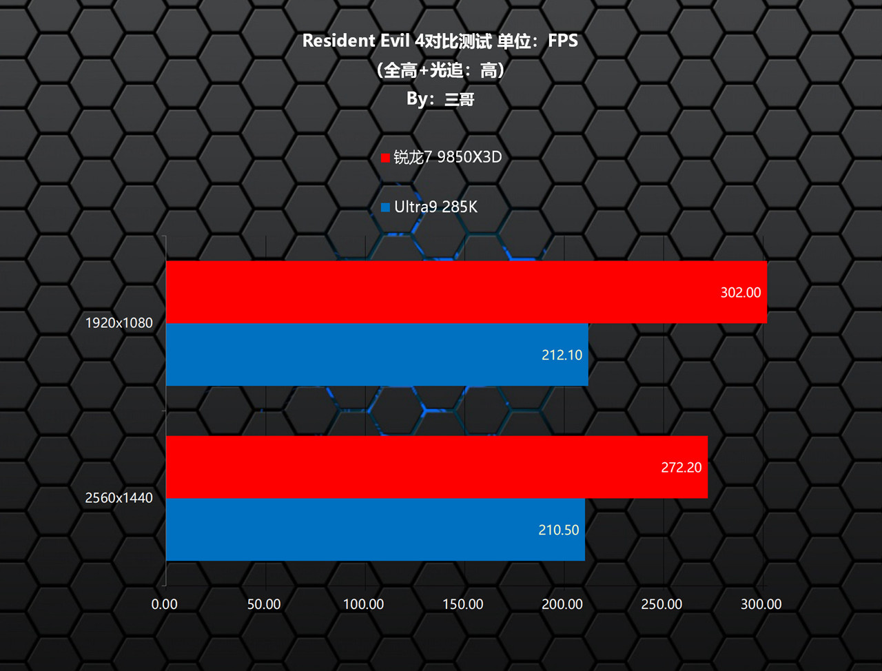 在《Resident Evil 4》测试中,锐龙7 9850X3D相较Ultra9 285K,在两个分辨率下均有非常夸张的领先,其中1080P分辨率下领先了89.90帧,领先比率42.39%;1440P分辨率下领先了61.70帧,领先比率29.31%。