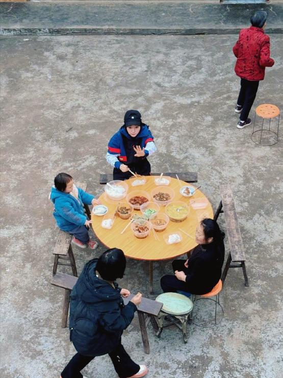▲到了饭点,一家子在院子里摆了一张圆桌,桌子上的菜看着怎么像点的外卖呀