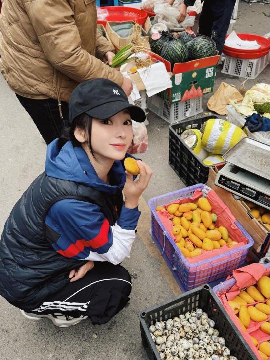▲在镇上的小集市的路边摊,柳岩蹲在摊位旁,买着几块钱一斤的芒果