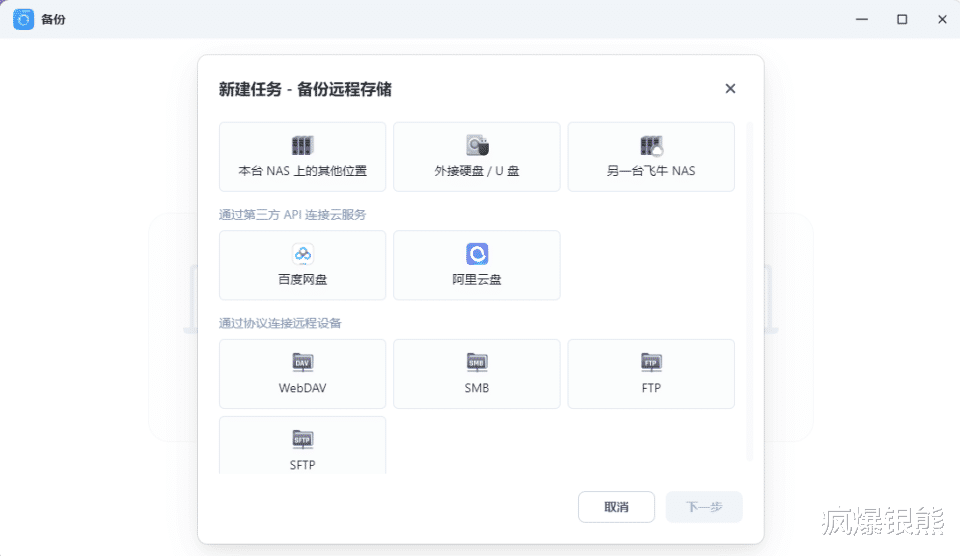 通过该软件我们可以轻松的将NAS上的内容备份到外接硬盘/U盘,另一台飞牛设备,百度网盘、阿里云盘及通过多种协议链接到NAS的远程设备,就备份的手段而言,还是非常丰富的。