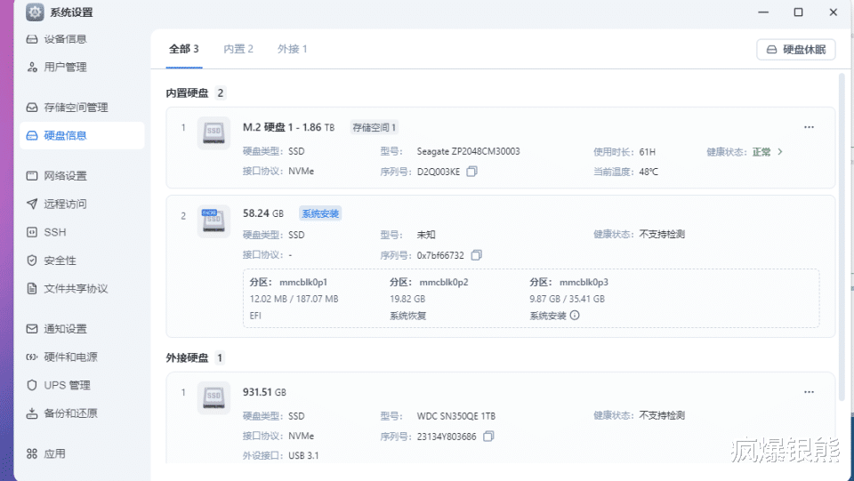 定制系统还支持盘位识别,而且系统硬盘信息内内可查看每一个硬盘的详细信息和状态,同时也支持健康状态监测。