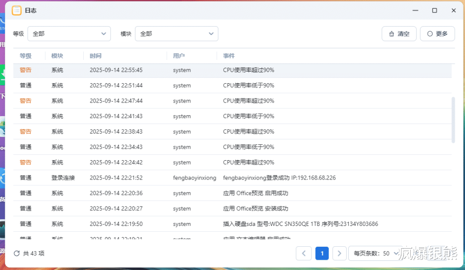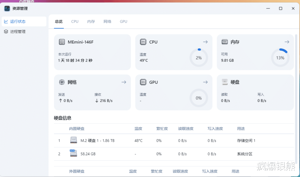 资源管理能够实时显示当前处理器、内存、网络和GPU、硬盘等硬件状态,日志内也会实时显示设备异常状态,让用户做到心中有数。