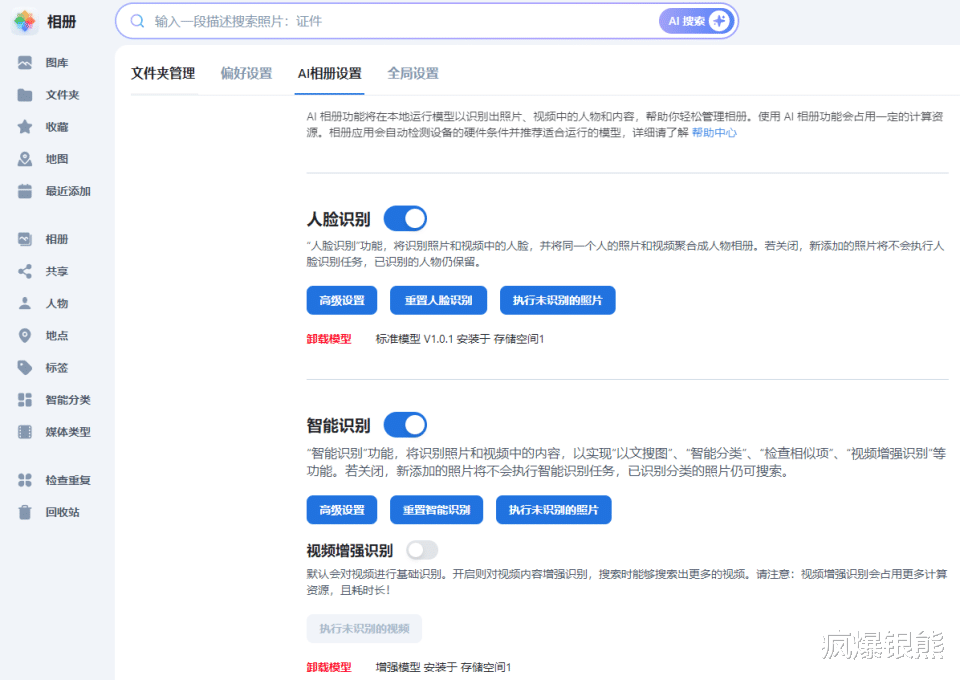 另外飞牛OS还为不同颜色的零刻ME mini配置了专属的设备图标,让用户享受到了专属定制的赶脚。另外其还相册内置了AI模型,显卡支持了AI人脸识别等功能,后面也会提到。