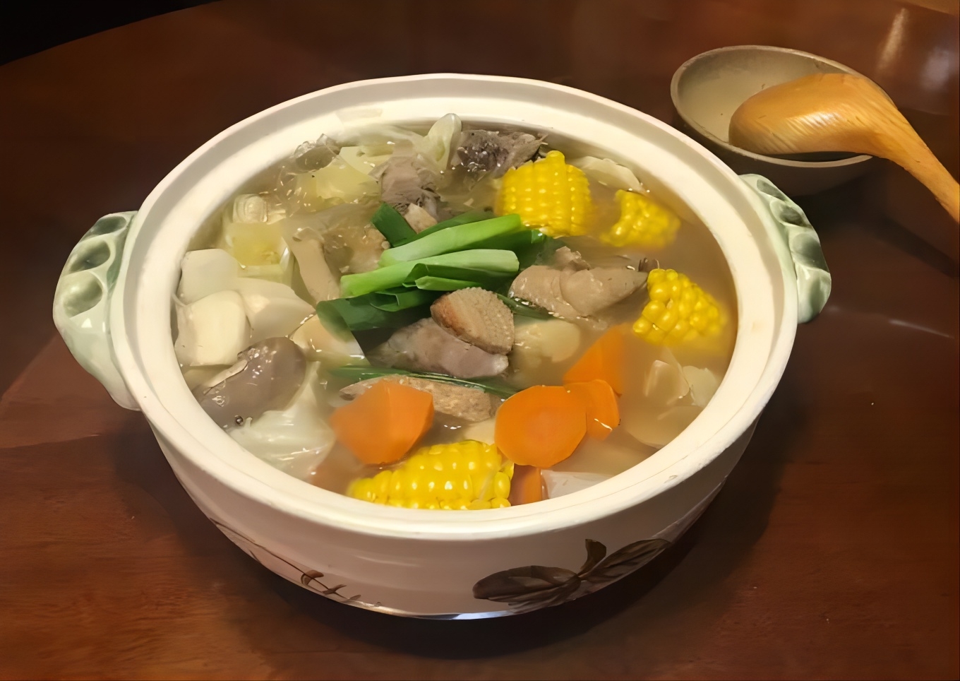 5.煮约25分钟后,陆续加入玉米、杏鲍菇、高丽菜、宽粉,煮熟后放入盐、胡椒粉调味。