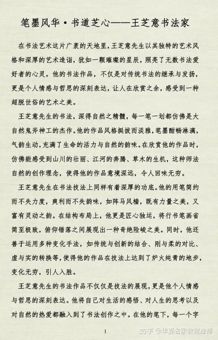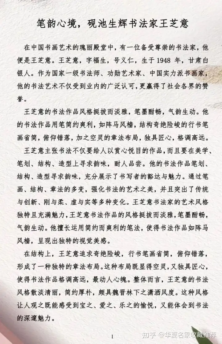王芝意,字福生,号义仁,生于1948年,甘肃白银人。中国楹联学会会员,中国高级书画创作师、中国国家一级书法师、中华人民共和国书法大家、国际殿堂级艺术大师、世界文学界功勋艺术家、CCTV央视书画频道签约艺术家、中国实力派书画家、高级工程师。现任中国书画家协会副主席,中央美术学院书法系客座教授、中国硬笔书法协会副教授、国宝级央新名人档案:“特聘名誉主席”、中国书画艺术非遗传承委员会常务副主席、中央电视台CCTV文化强国“高级智库首席专家”沈鹏书法艺术工作室专家组高级理事、美丽中国栏目组特邀导师、中华文化促进会美育工作委员会艺术顾问、中国书画交易中心艺委会主席、中国国际艺术馆名誉馆长、中国一品堂书院名誉院长。退休于甘肃中医药大学。出版的学术专著有《敦煌外治法》、《释商》——事业·人生·思想。