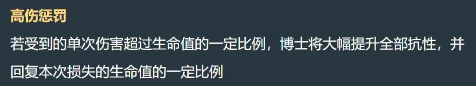 除此之外,如果旅行者一方受到的单次伤害超过生命值的一定比例,博士将大幅提升全部抗性,并且回复本次损失生命值的一定比例,所以如果你手法不好的话钟离这个角色是面对博士的最佳选择,只要你不扣血量他就不会提高抗性效果以及回血。