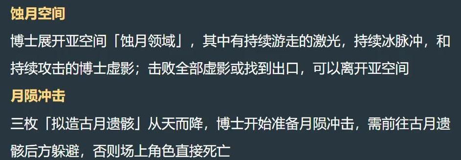 博士还会展开一个亚空间,叫做蚀月领域,其中有持续游走的激光以及冰脉冲,同时博士会生成三个虚影,击败全部虚影找到出口就可以离开亚空间。