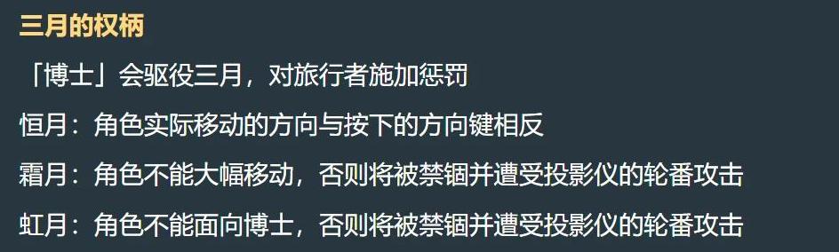 首先博士他拥有3月的权柄,所以会驱使3月对旅行者施加惩罚,惩罚根据不同的月亮造成不同的效果,恒月形态下角色实际移动的方向与按下的方向键相反,霜月形态下角色不能大幅移动,否则将被禁锢并且遭受轮番攻击,虹月形态下角色不能面向博士,否则将被禁锢并且遭受轮番攻击。