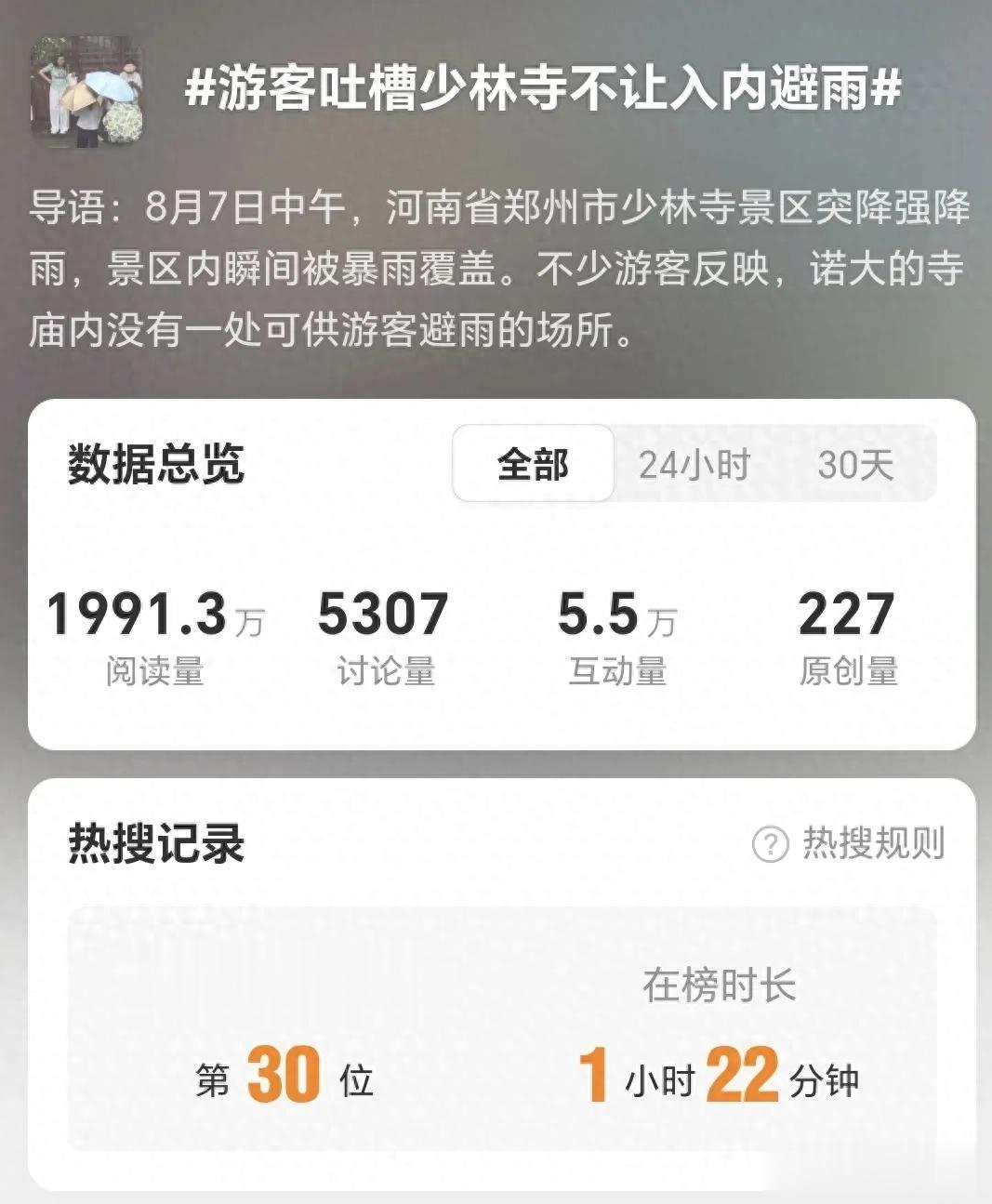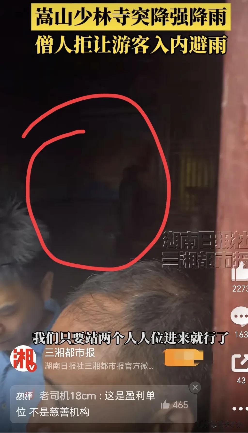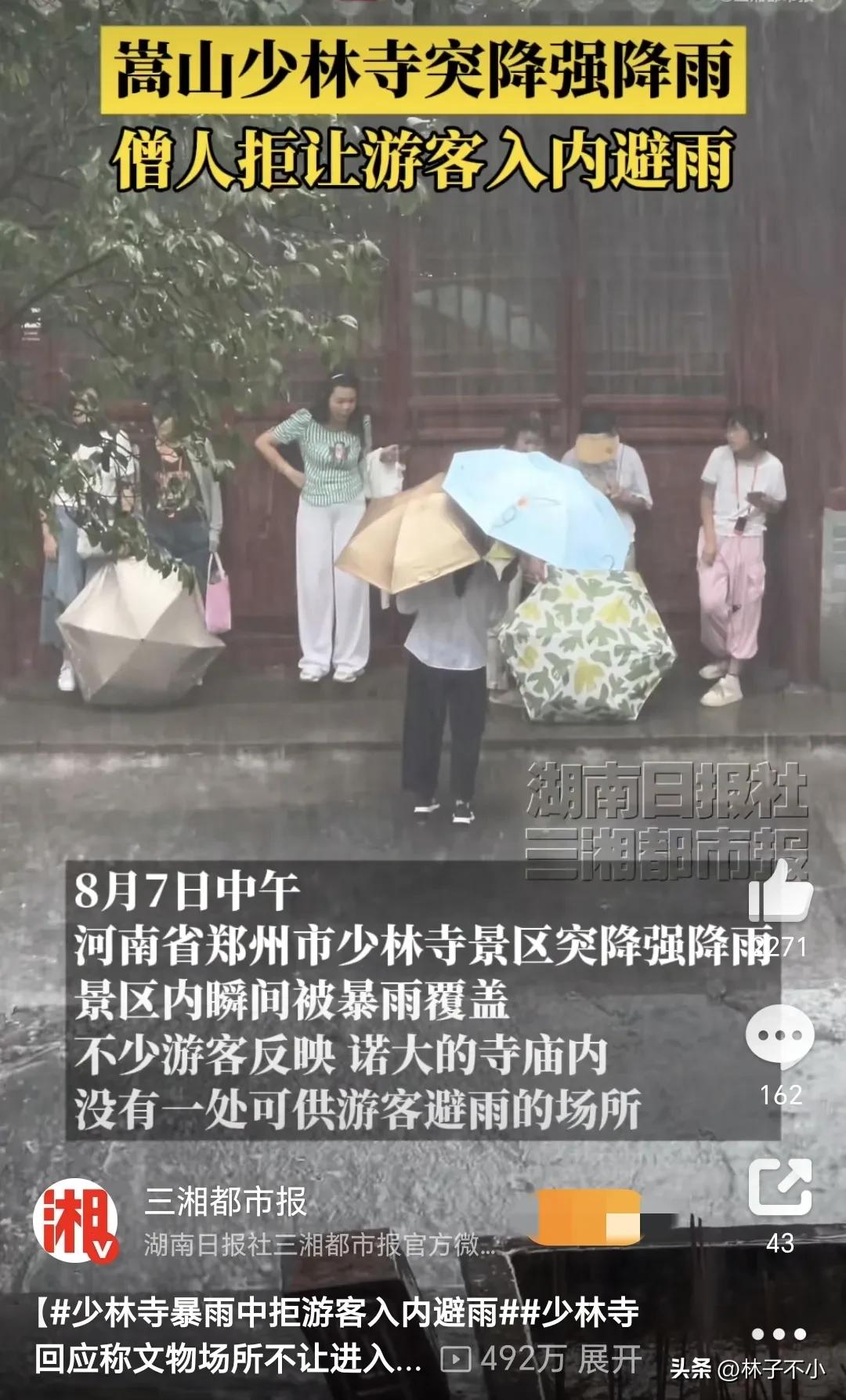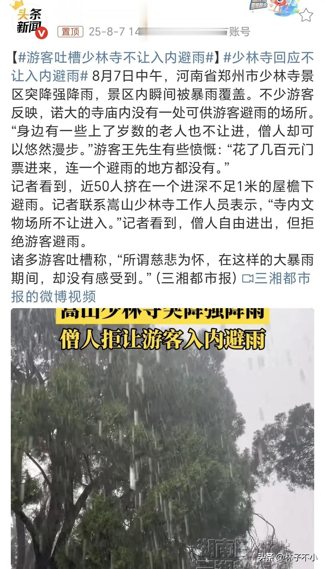 游客吐槽少林寺不让入内避雨2025年8月7日,微博有一个很小众的热搜:游客吐槽少林寺不让入内避雨。