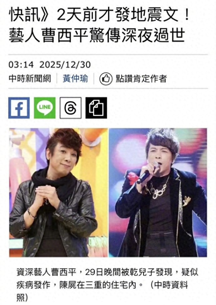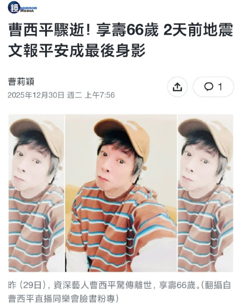 12月29日晚间,中国台湾资深艺人曹西平猝逝家中的消息震惊全网。据台媒报道,曹西平的干儿子因长时间联系不上他前往探望,发现时他已离世多时,救护人员到场后确认其遗体已出现明显尸斑与僵硬现象,经家属同意未送医,现场交由警方处理。而就在两天前,经历宜兰强震后的他还在社交平台发文感慨人生,那句“没有什么事情是过不了的”,成了他留给世界的最后注脚。